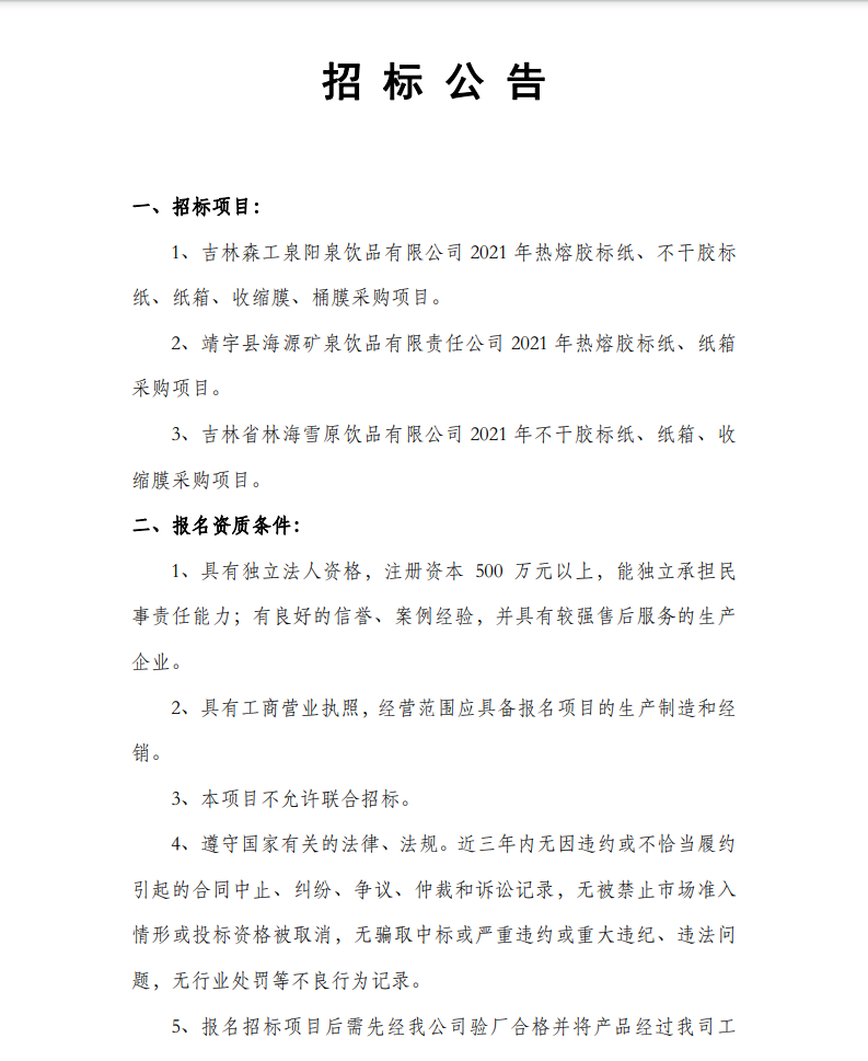2021年度熱熔膠標(biāo)紙、不干膠標(biāo)紙、紙箱、收縮膜、桶膜招標(biāo)公告